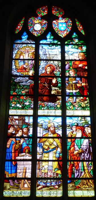 Deux scènes en deux registres : au registre supérieur, Charlemagne se fait présenter le plan de la basilique d'Aix-la-Chapelle. Au registre supérieur, à l'arrière-plan, l'abbaye de Fontevraud et au premier plan un homme à genoux devant une représentation du Christ en croix. La scène représente la fondation de Fontevraud après la vision de Robert d'Arbrissel.