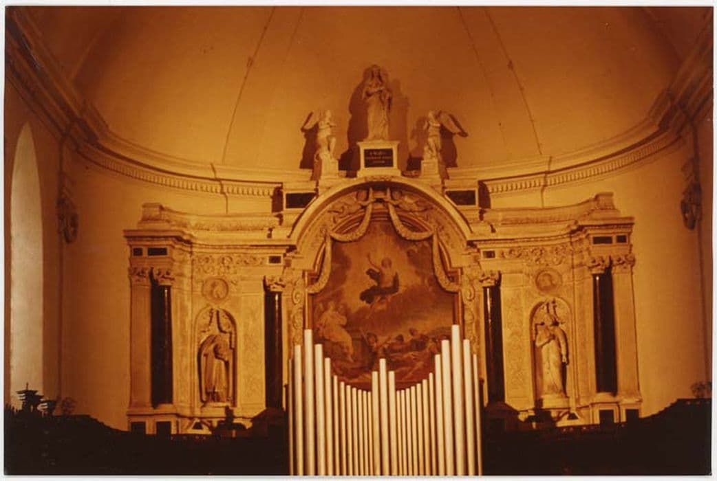Retable en pierre formé en partie centrale de deux colonnes de marbre noir encadrant une toile peinte à l'huile. De part et d'autre, deux autres colonnes encadrent des niches abritant des statues.