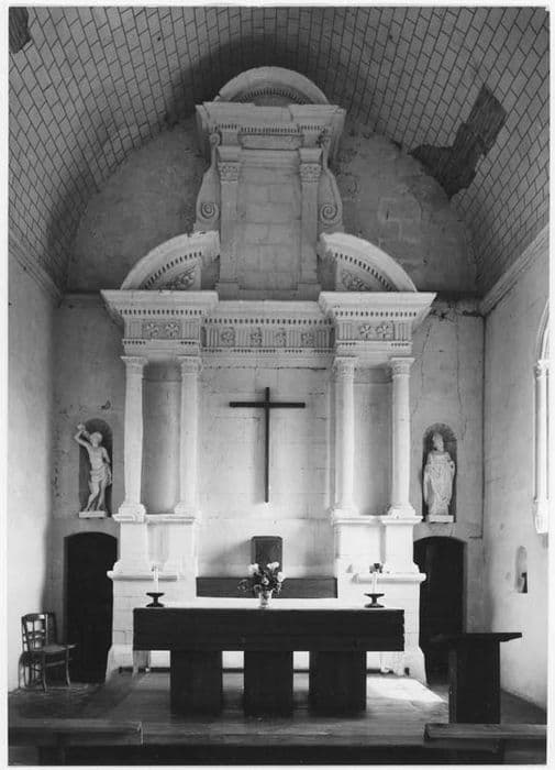 Retable à un corps et deux niveaux dont la toile centrale et l'autel ont disparu. Il est formé d'un haut soubassement sur piédestal supportant quatre colonnes jumelées à fût lisse et un entablement avec fronton cintré interrompu. Le deuxième niveau est composé d'un édicule central à un corps formé d'un panneau central nu encadré de deux pilastres supportant un entablement et fronton cintré. De chaque côté du retable, deux niches concaves dont le cul-de-four est orné d'un coquillage sont creusées dans le mur.