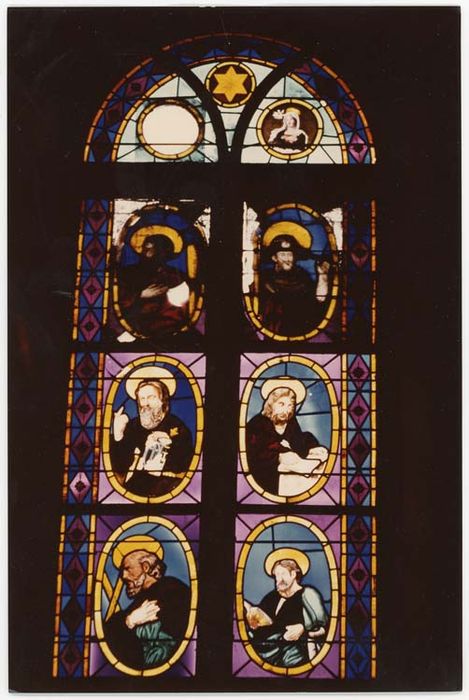 Fenêtre à baie en plein cintre. Verrière composée de six panneaux ainsi que de trois dans le tympan, montés sur des châssis de bois, à la manière d'une fenêtre ouvrante.