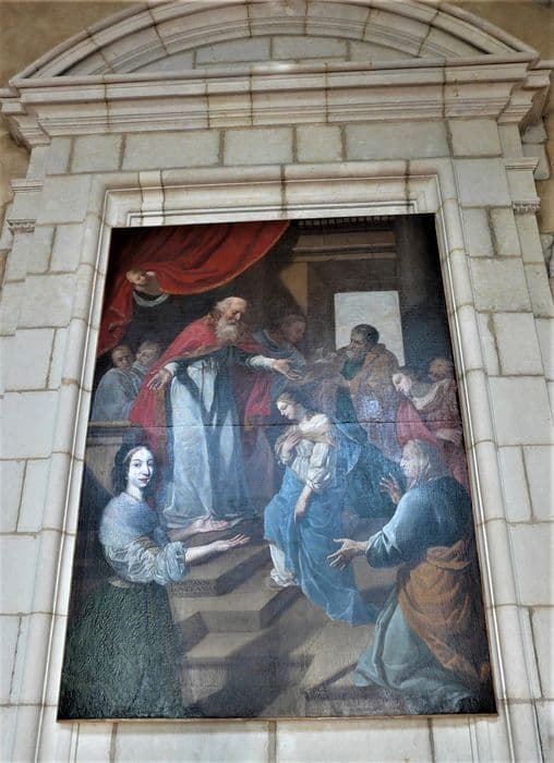 La composition s'organise en diagonale : en haut à gauche le grand prêtre, au centre la Vierge et en bas à droite sainte Anne. Trois personnages assistent à la scène en haut à gauche. A droite, Joachim se détache sur une fenêtre et offre des tourterelles dans un panier. Deux autres personnages complètent la scène. Au premier-plan, à gauche, la donatrice, Anne Louet, est représentée en pied, les mains tendues en avant.