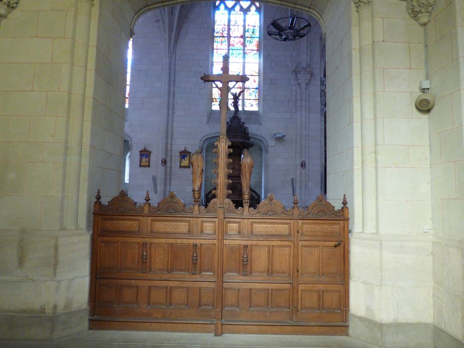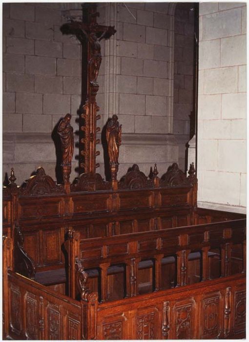Décor de balustres, de motifs enroulés et de panneautages. Accotoirs sculptés de quatrefeuilles ajourés et de consoles enroulées. Un calvaire en ronde-bosse apparaît sur la partie postérieure du banc d'oeuvre.