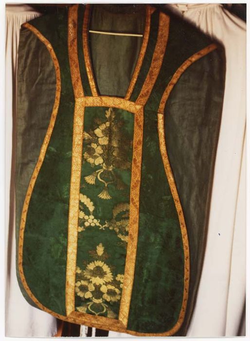 Une chape verte présentant un décor de plantes et de fleurs, en tissu de soie broché or, avec galon or sur le pourtour, inscrite au titre objet en 1979, fait partie du même ornement liturgique catholique.