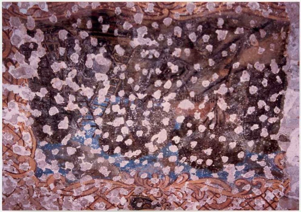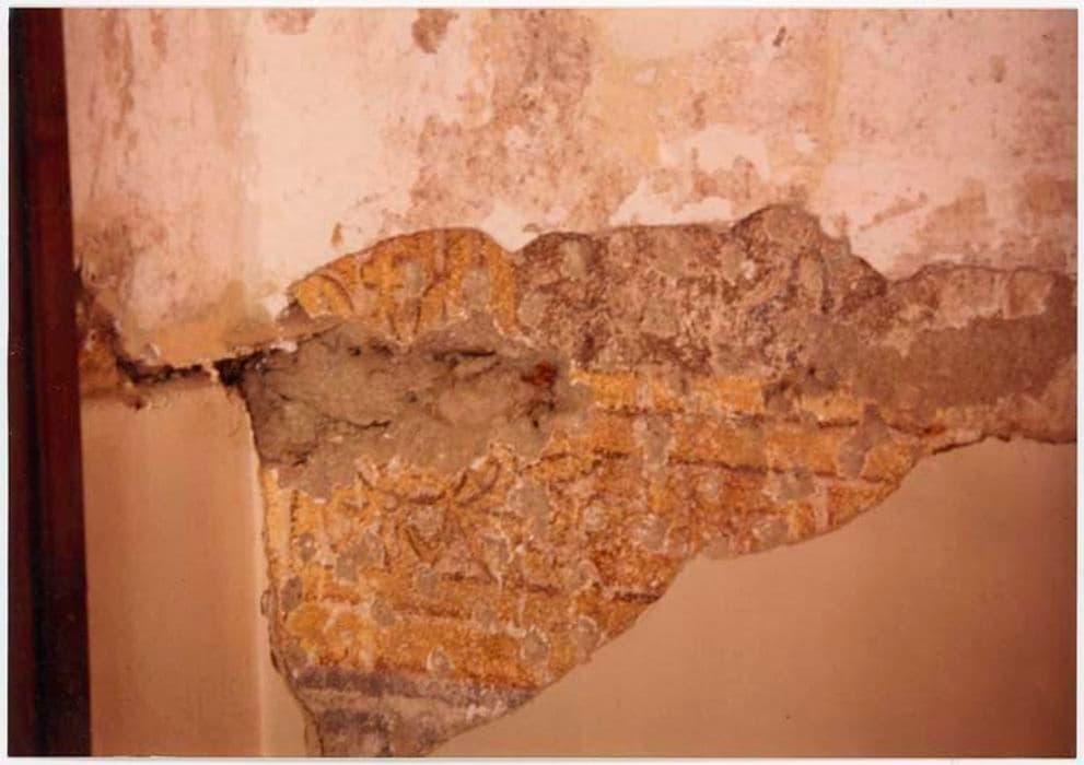 Peinture monumentale sous un enduit et un papier peint récent. Décor peint de haut en bas.