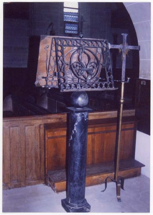 Colonne cylindrique en marbre supportant une sphère en marbre sur laquelle est posé le pupitre en fer forgé. Celui-ci se compose de deux tables identiques se réunissant en leur sommet. Latéralement, se trouvent deux bougeoirs articulés.
