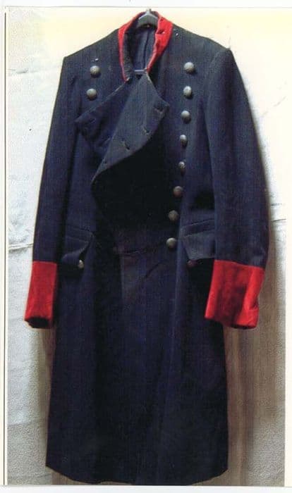 La redingote est faite d'un drap de laine noir avec col et bas des manches en velours rouge. Deux fausses poches. Le pantalon, assorti, a deux poches. Bicorne sans plumes, en tissu noir, galon argenté sur les bordures et bouton.