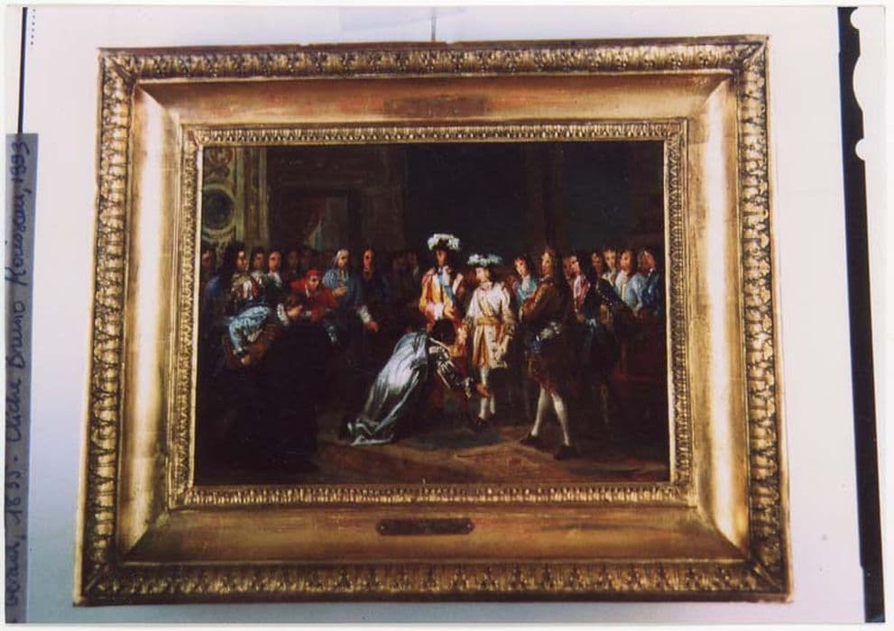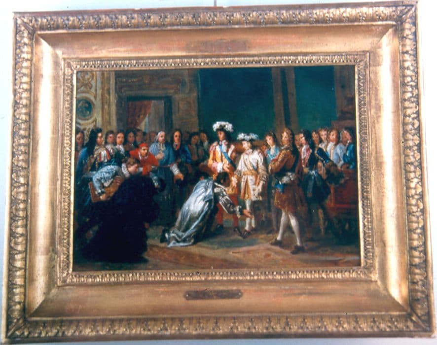 Au centre, Louis XIV présente son petit-fils, Philippe, duc d'Anjou et roi d'Espagne sous le nom de Philippe V. A droite, les princes : Monsieur, frère du roi de France, le Grand Dauphin, le duc de Bourgogne, le Prince de Conti, le duc du Maine, le duc de Bourbon ; à l'arrière-plan, Bossuet et le Père Lachaise ; à gauche, le ministre Torcy, Mansart, le duc de Villiers. Au premier plan, l'ambassadeur d'Espagne s'agenouille.