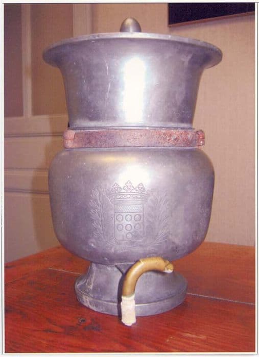 Fontaine de forme balustre, à couvercle plat, surmontée d'une prise en forme de gland. Le bec amovible en forme d'animal est en bronze. Au-dessus de la panse, une bande en retrait dans l'étain permet de placer une fixation en fer forgé enserrant la fontaine et permettant de la fixer par deux points dans le mur.