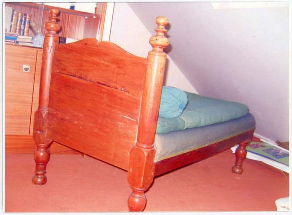 Lit à un seul chevet, légèrement chantourné, encadré de deux colonnes engagées surmontées de toupies. Quatre pieds tournés. L'ensemble est chevillé.