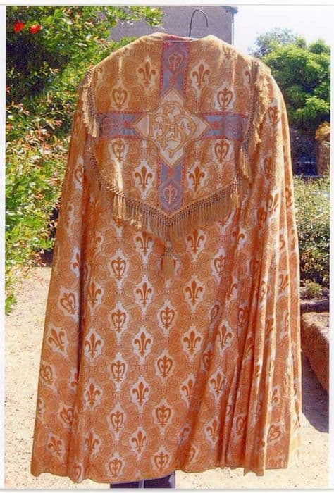 Tissu blanc et motifs à dominante jaune d'or inspirés des tissus à la grenade du 15e siècle. Les chapes sont pourvues d'un chaperon à franges d'or, décoré d'une croix avec galon à fond bleu et losange central à fond blanc. Le même décor se retrouve sur les deux chasubles. Doublure de tissu bleu.