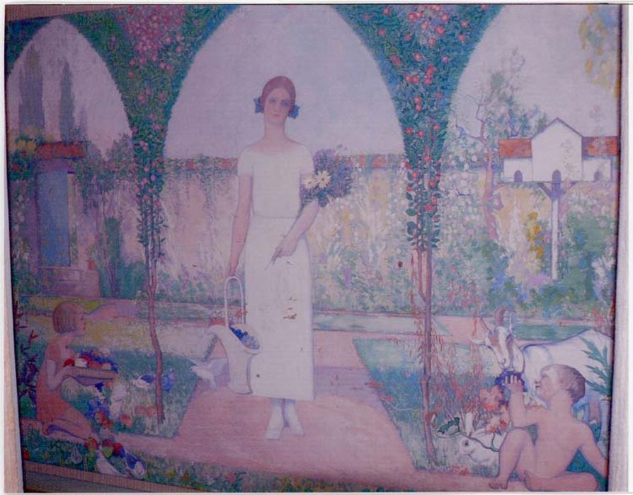Dans un jardins clos, sous des arcades végétales, une jeune fille se tient debout, vêtue d'une longue robe blanche, tenant d'une main un panier et de l'autre un bouquet de fleur. A gauche, agenouillée, se tient une fillette, tenant une coupe de fruits. A droite, un enfant, nu donne du raisin à une chèvre. Derrière lui, un lapin.