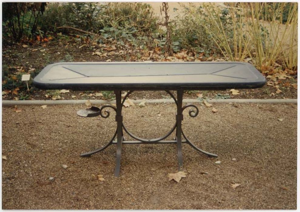 Plateau en ardoise, incurvé au centre avec des rainures dans les angles et au milieu un trou pour permettre l'écoulement des liquides. Piétement en fonte moulurée avec un petit plateau rond placé sous le trou d'écoulement.