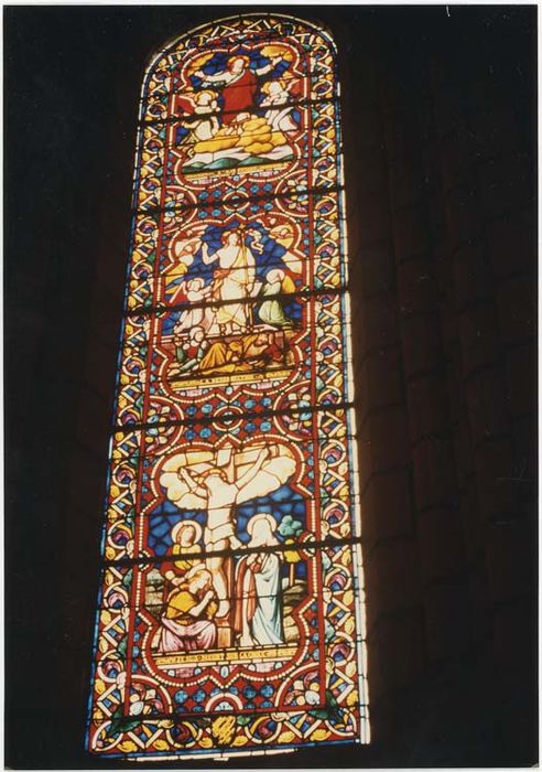 Vitrail de type archéologique, inspiré des verrières du 13e siècle, à médaillons historiés, accordant une place importante à la couleur bleue.