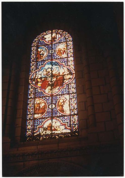 Vitrail de type archéologique, inspiré des verrières du 13e siècle, à médaillons historiés, accordant une place importante à la couleur bleue.