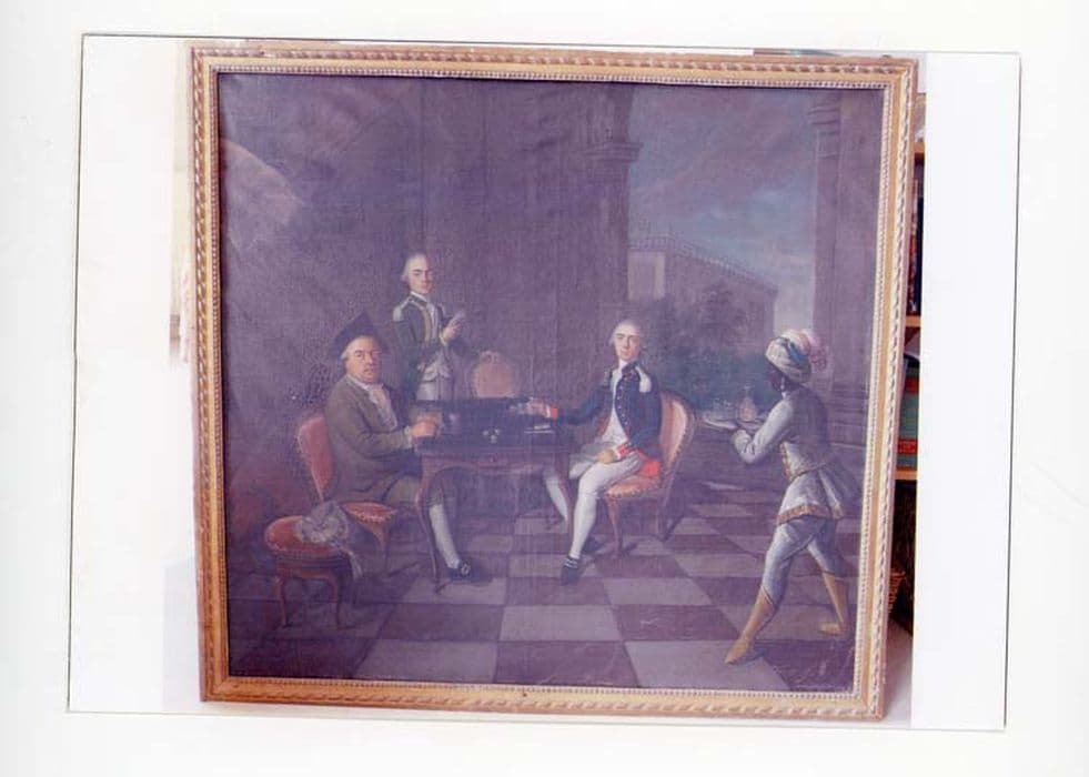 Dans un salon à grandes dalles de marbre rouge et blanc, largement ouvert par une grande arcade vers un jardin et un pavillon, un homme en habit vert portant un tricorne, joue à une table de tric-trac avec son fils en costume militaire bleu et blanc. Son autre fils se tient debout, derrière la table, tenant un petit livre dans la main gauche. Les trois personnages regardent le spectateur. Un serviteur noir en costume blanc à bordure or, turban à plumes et boucles d'oreilles, apporte une carafe et trois verres sur un plateau. Il s'agit de Hyacinthe-René, marquis de Quatrebarbes (1713-1794) et de ses deux fils, Hyacinthe-Charles-René (1759-1835), capitaine de cavalerie au régiment de Royal-Lorraine et d'Augustin-Lancelot (1763-1842), officier aux dragons Penthièvre.