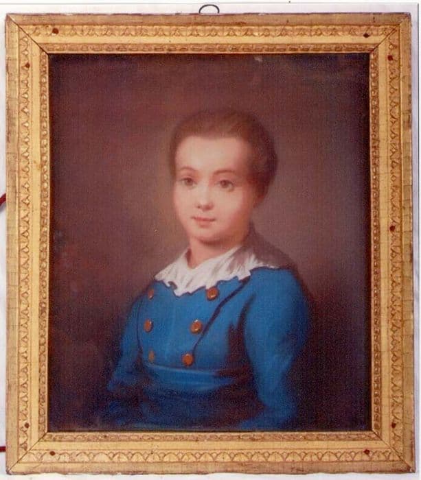 Le modèle est représenté enfant, vêtu d'une veste bleue ornée de six boutons dorés et d'un col blanc rabattu sur la veste.