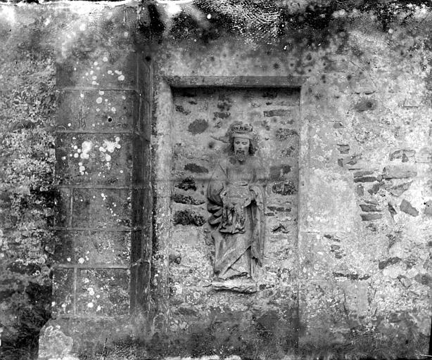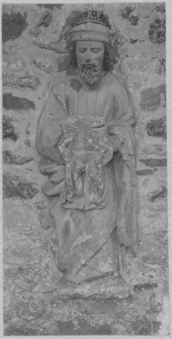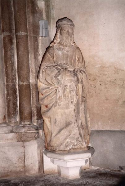 Oeuvre anciennement datée du 13e ou du 14e siècle, et semble-t-il autrefois identifiée comme représentant la Trinité. Ce groupe a été autrefois remployé à l'extérieur dans la maçonnerie de la porte nord de la nef, puis ôté du mur en 1991-1992.