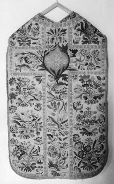 Ornements d'époque Louis XIV, ayant appartenu à M. l'abbé Lesple-Dupré, curé d'Avranches, et Vicaire Général de 1804 à 1837. La chasuble a manifestement été retaillée.