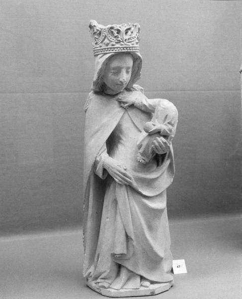 Vierge à l'Enfant couronnée. La tête de l'Enfant est manquante, et la tête de la Vierge a été brisée au niveau du cou.