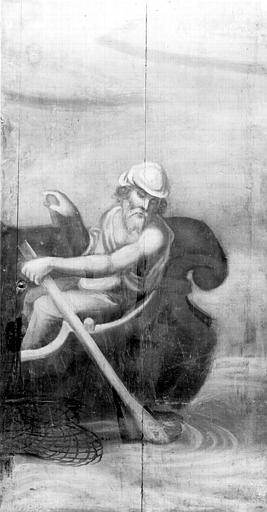 Sur le revers du panneau droit est représenté en grisaille un homme assis dans une barque.