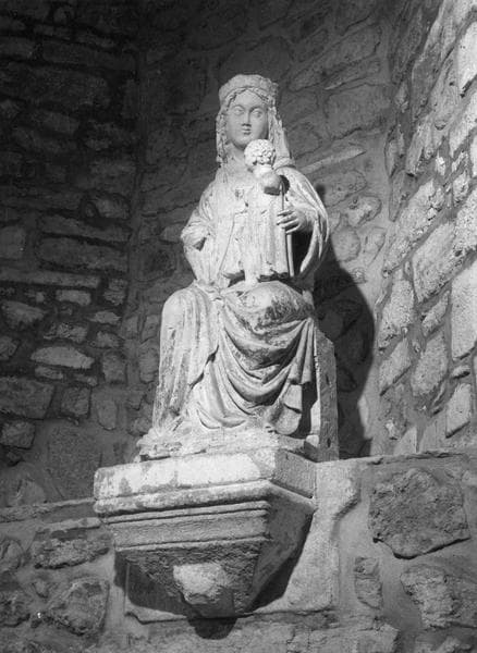 Vierge à l'Enfant assise, comportant des traces de polychromie. La tête de l'Enfant a été refaite. Le bras droit de la Vierge manque.