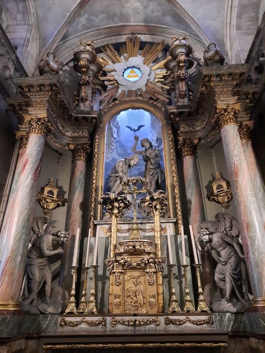Cet autel est doté de gradins d'autel, d'un tabernacle, d'une exposition, d'une croix d'autel, de six chandeliers d'autel, d'un retable et d'un groupe sculpté représentant le Baptême du Christ.