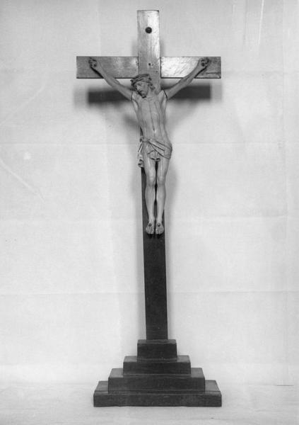 Le Christ est en ivoire, la croix, en bois.