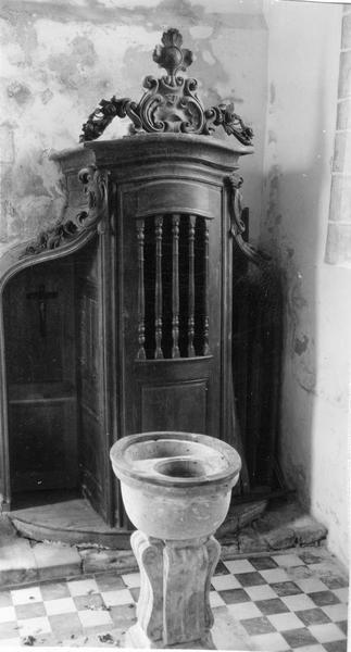 Inscription concernant le donateur : TOUS LES OUVRAGE QUI SONT DANS CETTE EGLISE ONT ETE DONES PAR Mr LE GALLOI CURE DE CE LIEU ET ONT ETE FAIS PAR G. LE GALOIS CURE DE CE LIEU A DONNE TOUS CES OUVRAGES (sur les sièges amovibles des deux confessionnaux).