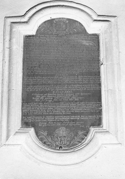 Epitaphe partiellement martelée, constituée d'une plaque en marbre noir gravé, dans un cadre en pierre calcaire moulurée.