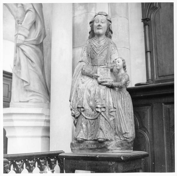 La statue de sainte Anne a été surchargée d'ornements peints, mais la polychromie d'origine existe toujours et est visible par endroits.