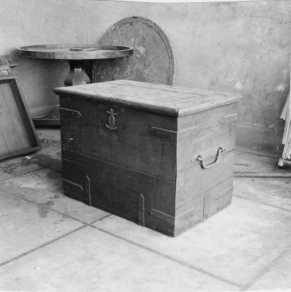 Coffre de port ou de corsaire en bois de chêne avec garnitures en fer.