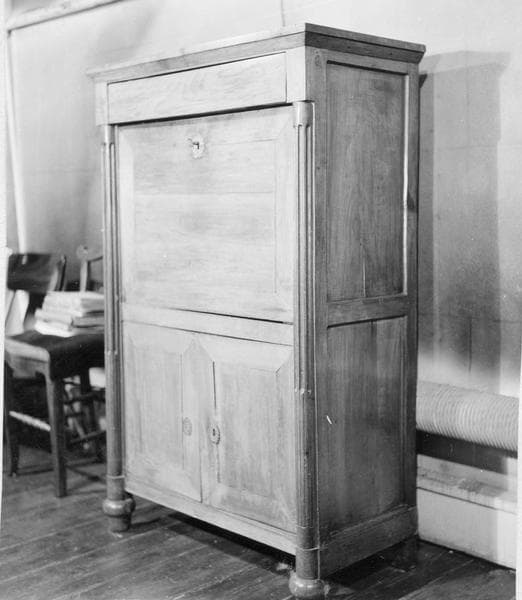 Secrétaire à un tiroir supérieur, un abattant, cinq tiroirs intérieurs, deux portes inférieures, deux colonnes cannelées et rudentées, joues à deux panneaux. Bois de merisier mouluré, avec garnitures et pentures en bronze et en laiton.