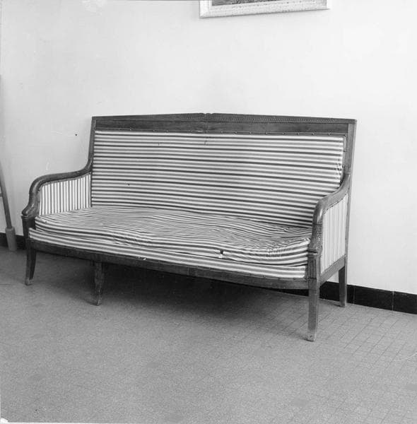 Canapé à têtes de dauphins en bois d'acajou sculpté, avec siège en velours vert rayé.