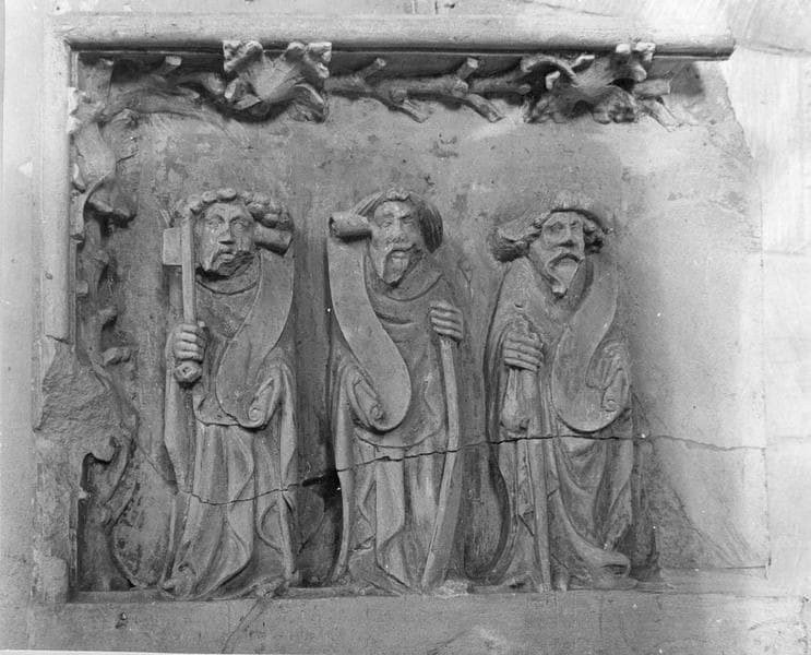 Ces bas-reliefs sont des fragments d'un retable aux douze apôtres en pierre calcaire, présentant des traces de polychromie.