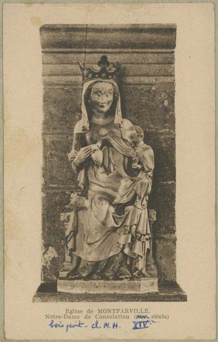 Oeuvre anciennement datée du 14e siècle, à rapprocher de la Vierge de Colomby.