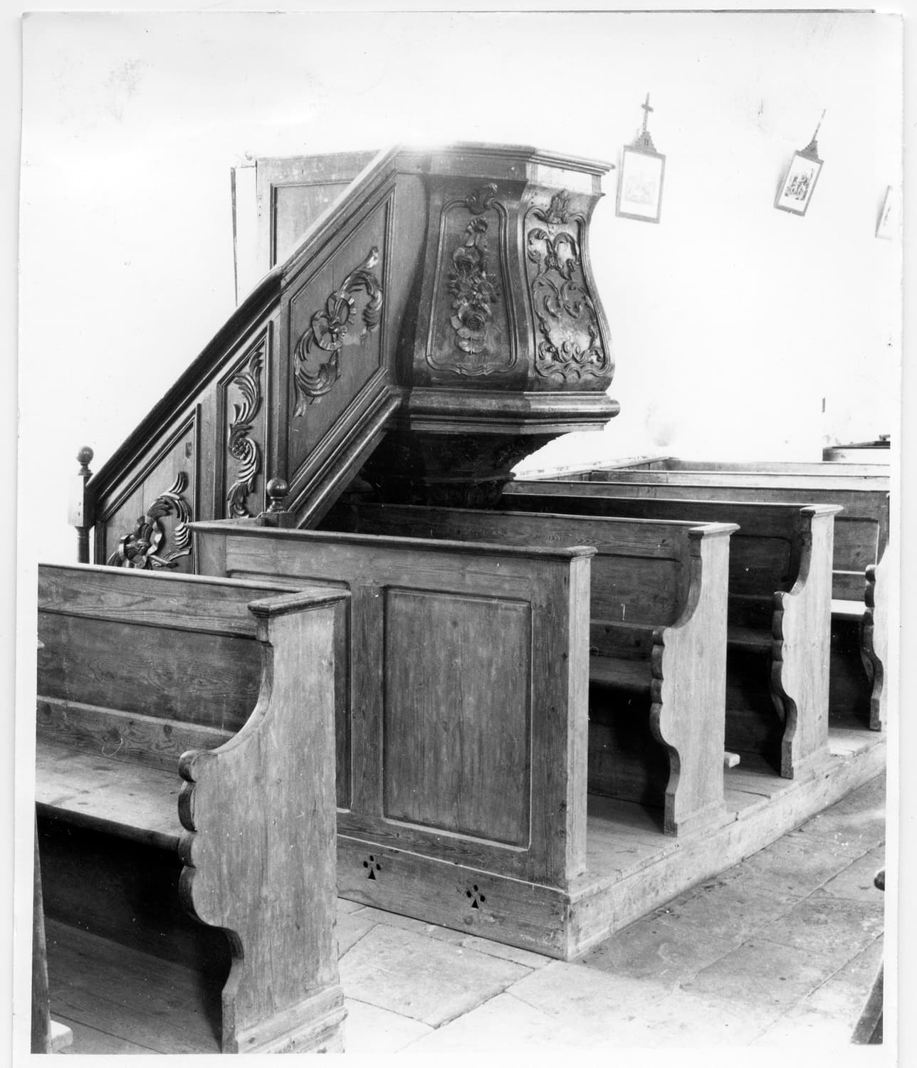L'ensemble est constitué de la chaire à prêcher, de l'escalier, de la cuve décorée de volutes, du dosseret et de l'abat-voix sommé de volutes.
