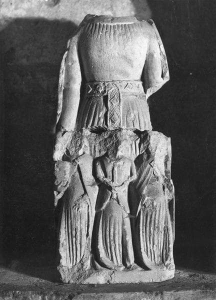 Statue en pierre calcaire présentant des traces de polychromie. La sainte est décapitée et son corps rompu à la hauteur du bassin, et les têtes des trois personnages sont martelées.