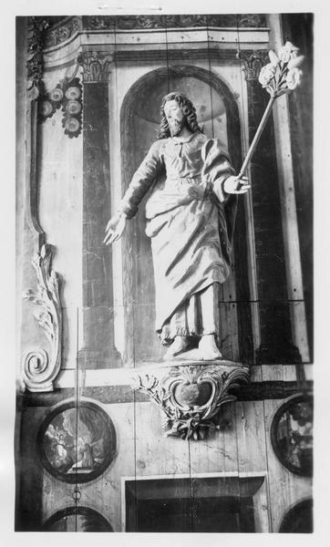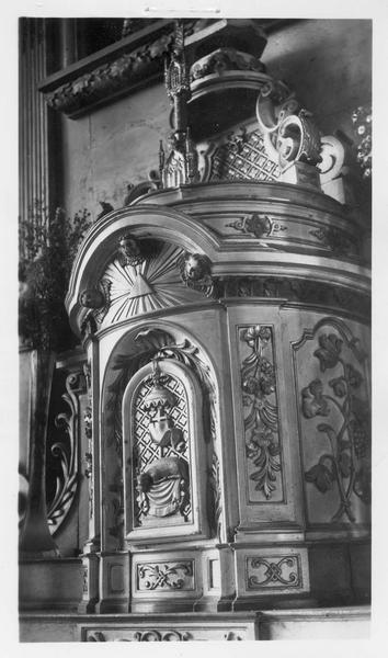 Ensemble anciennement daté du 18e siècle, en fait exécuté vers 1840. Les éléments remployés et provenant de l'ancien maître-autel ne dateraient pas du 17e siècle, comme cela a parfois été dit, mais du 18e siècle.