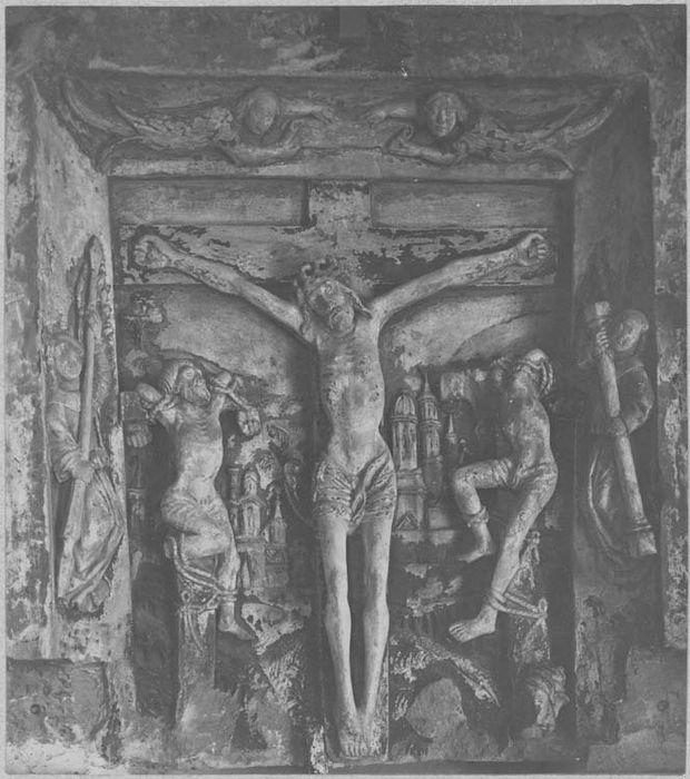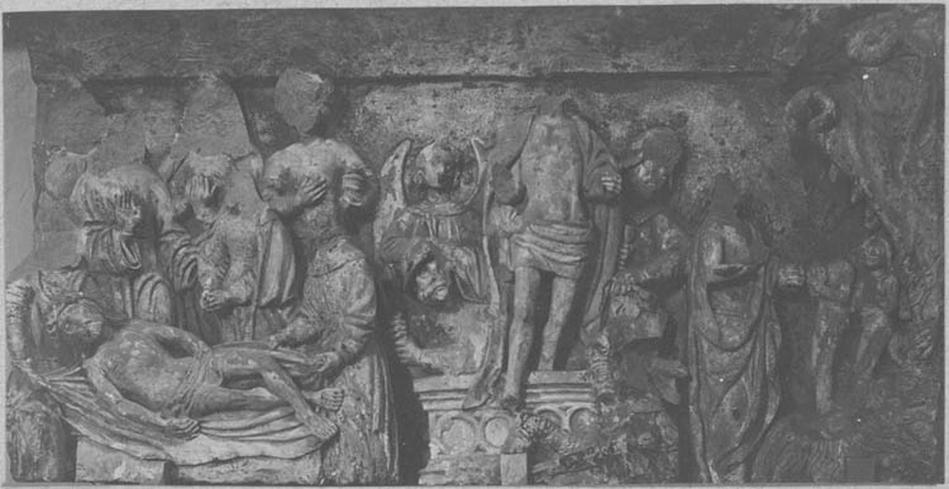 Ces trois bas-reliefs proviennent d'un retable de la Passion. Ils représentent respectivement l'arrestation de Jésus, la Flagellation, et la Montée au Calvaire, ainsi que la Crucifixion, la Mise au tombeau, et la Résurrection, puis, la descente aux limbes. Le visage du Christ lié au poteau a disparu.