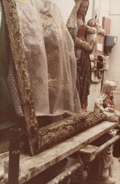 Le cadre, en bois polychromé sous badigeon, provient de l'ancien retable.