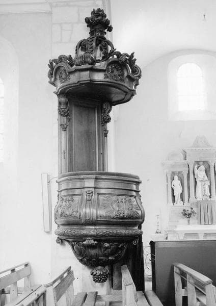 Chaire à prêcher avec escalier, cuve, dosseret, abat-voix et couronnement.