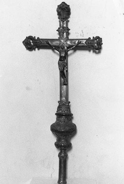 Croix de procession en argent sur âme de bois, avec une douille en cuivre.