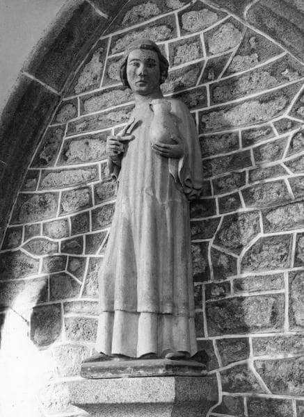 Statue en pierre calcaire polychromée sous un badigeon. Le vase et la main gauche du saint ont disparu.
