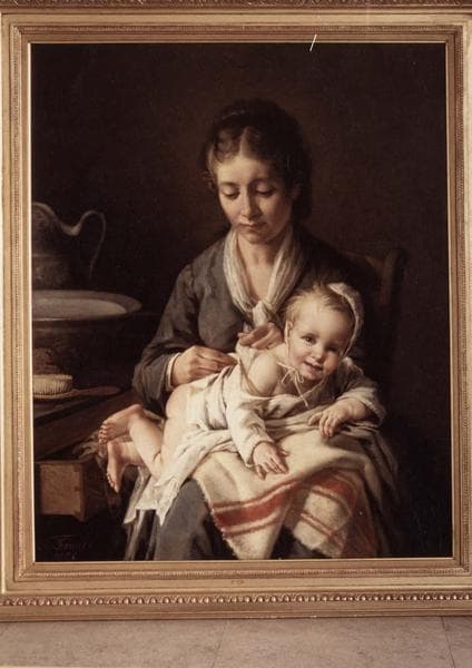 tableau : Adèle Fouace et sa fille Béatrice, dit La Toilette du Bébé, et son cadre