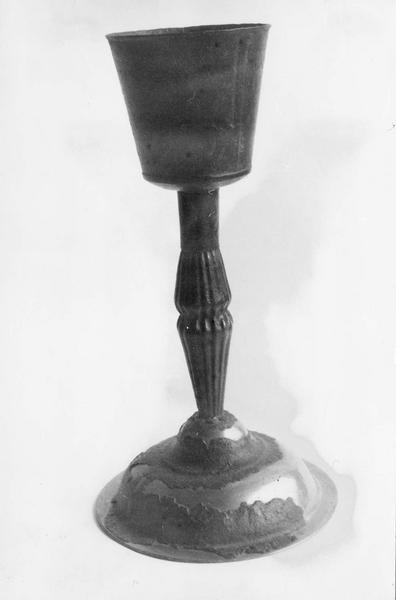 Tous les éléments de ce calice sont en ferblanterie soudée au plomb. La coupe, de forme tronconique, au bord très légèrement évasé, est formée d'une bande soudée latéralement. Le fond est constitué d'un disque concave soudé au vase et à un manchon cylindrique, qui s'enmanche sur un axe de bois situé à l'intérieur de la tige. Celle-ci est formée de deux parties tronconiques obtenues par soudure latérale. Le pied circulaire est composé d'un ombilic et d'une doucine terminée par une bâte, le tout obtenu par travail sur une bigorne. Tige et pied sont armés de plomb, pour assurer solidité et stabilité.