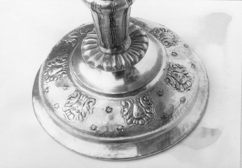 Calice en laiton martelé, soudé, rétreint, repoussé, gravé et argenté. L'intérieur de la coupe est doré.