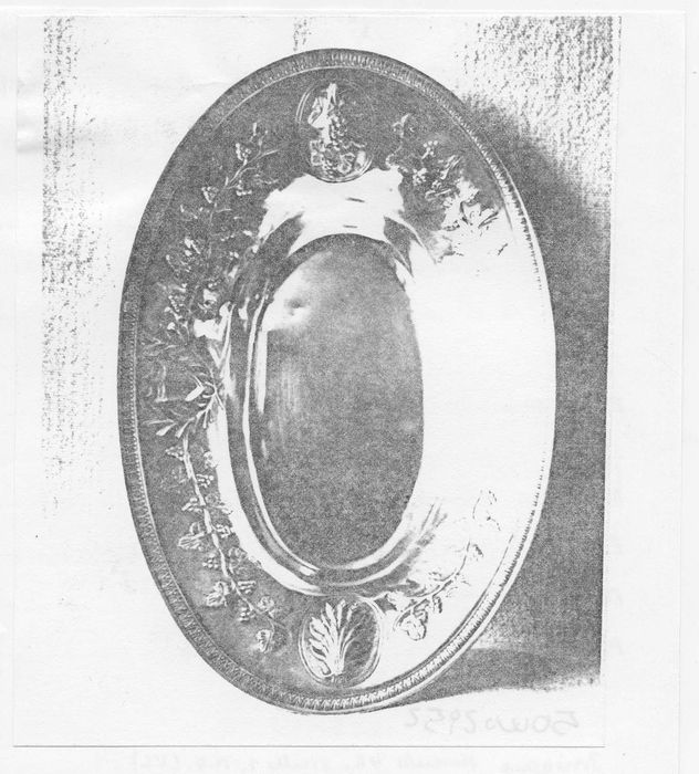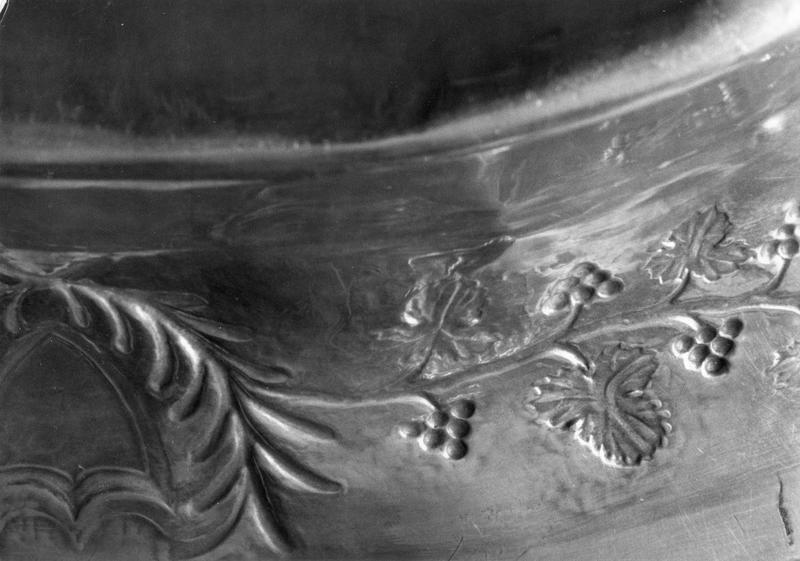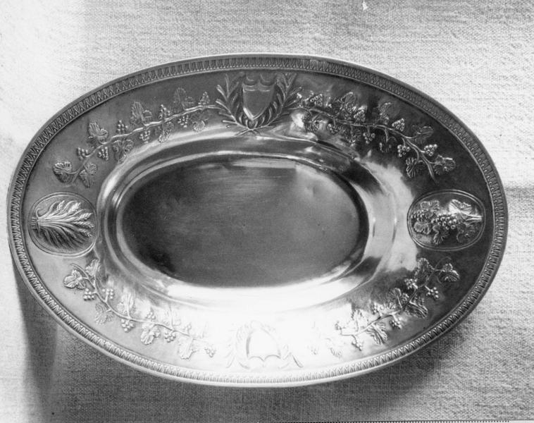 Plateau à burettes orné de gerbes de blé, de grappes de raisins et de deux écus en table d'attente.