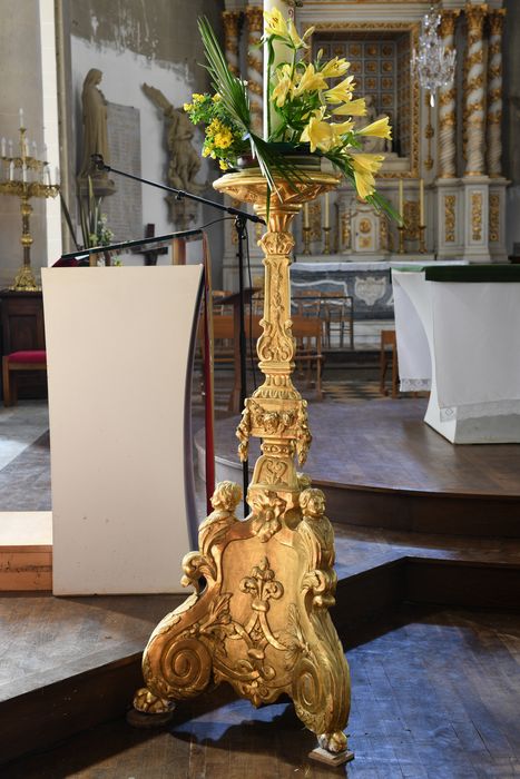 Ce pied de cierge pascal (pied tripode) est en bois de chêne doré, sous une peinture à la bronzine.
