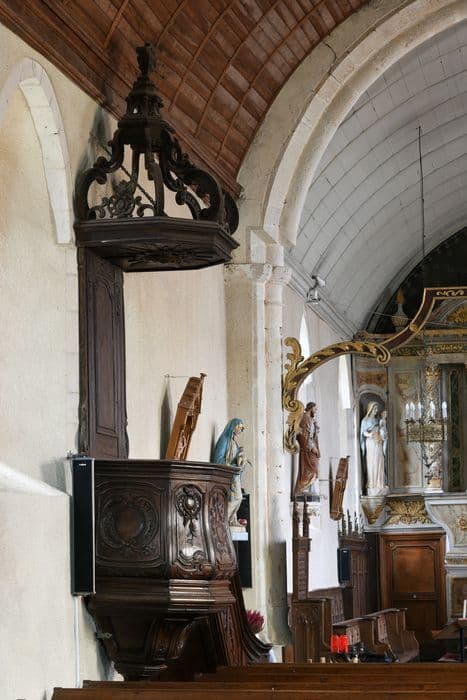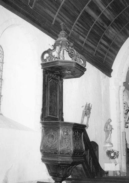 Chaire à prêcher, avec son escalier, son dosseret, son abat-voix couronné de six volutes et trois cartouches, et surmonté d'un pot fleuri.