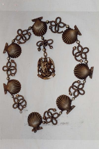 Collier héraldique de Saint Michel dans son écrin de cuir, composé de sept coquilles Saint Jacques reliées entre elles par des entrelacs évoquant des noeuds marins. L'ensemble se termine par une représentation de saint Michel terrassant le dragon.
